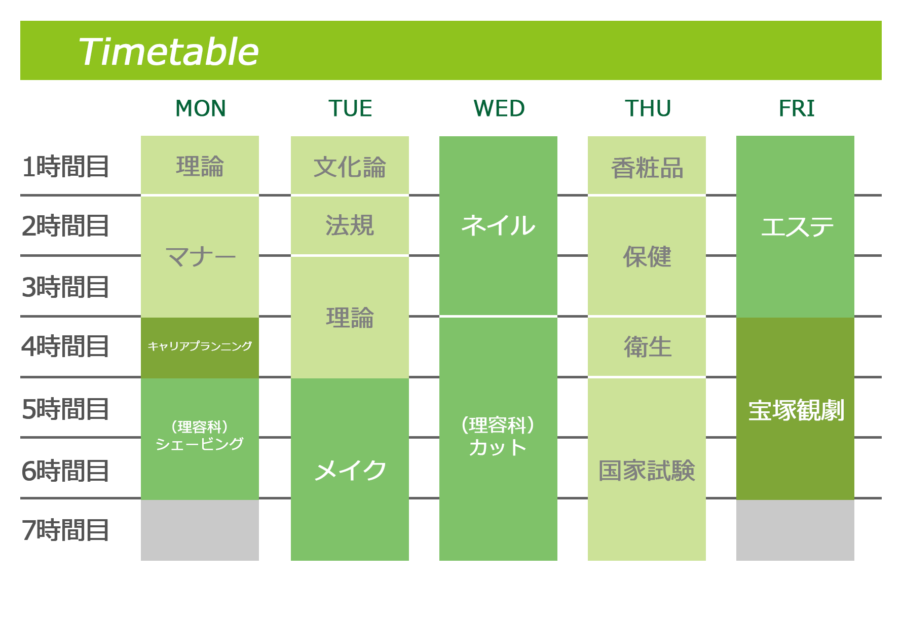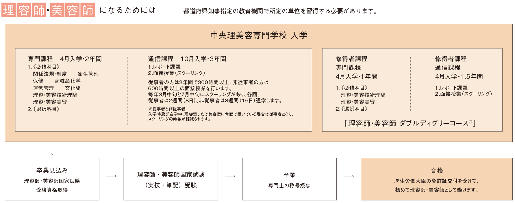 - ●関係法規・制度(30時間)●香粧品化学(60時間)●美容技術理論(150時間)